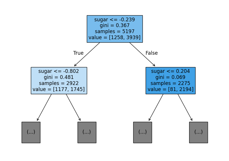 plot_tree(dt, max_depth=1, filled = True, feature_names=['alcohol','sugar','pH'])