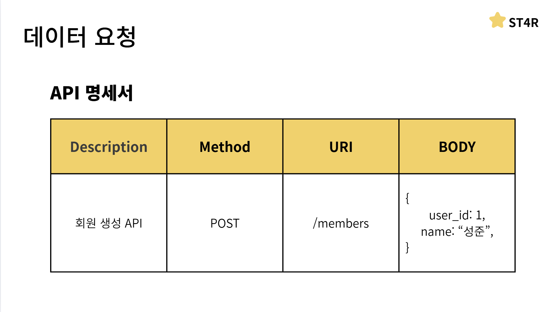 URI는/members가 들어가고 Body에는user_id와name이 들어가게 됩니다