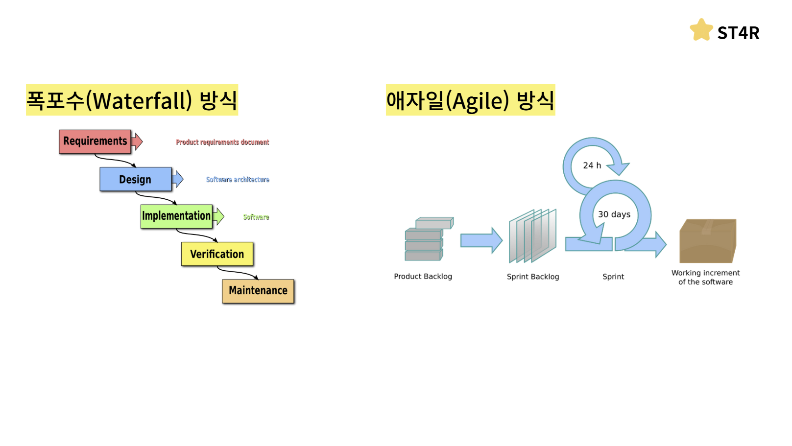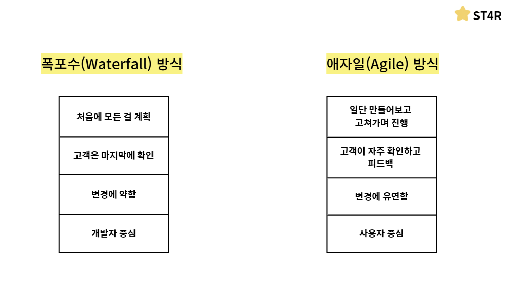 애자일 방식을 설명하기 위해서 폭포수방식과 비교해서 설명을 해드리겠습니다
