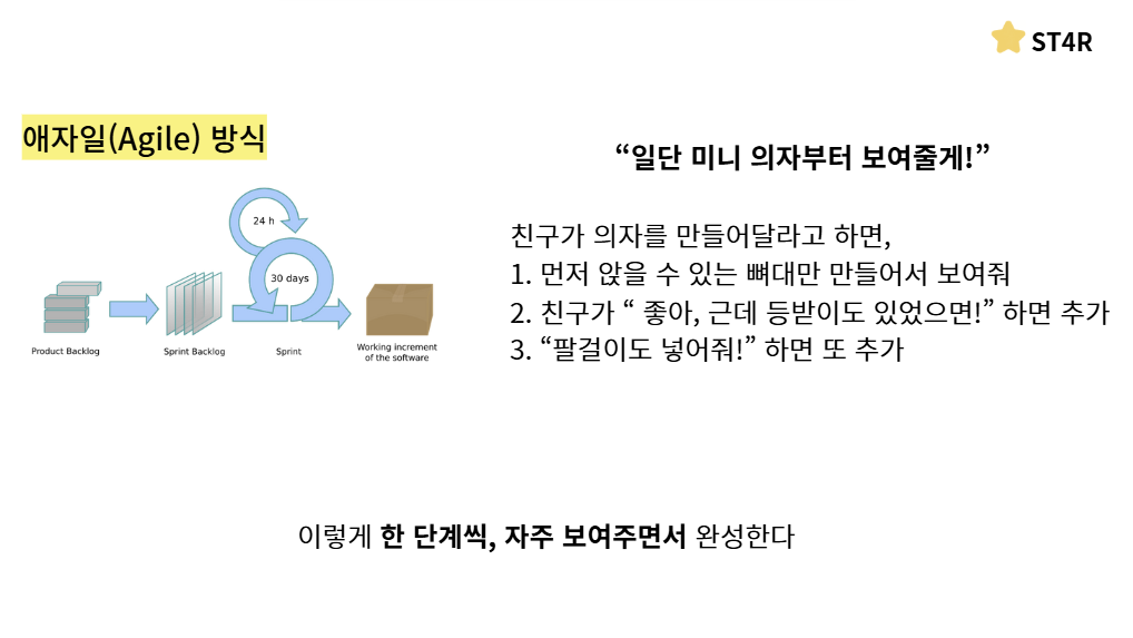 그래서 이를 보완하기 위한 방법으로 애자일 방식이 등장했습니다