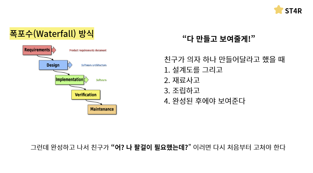 친구에게 완성시켜서 의자를 보여줬습니다이렇게 다 만들고 나서 보여주는 이런 방식을 우리는 폭포수 방식이라고 합니다