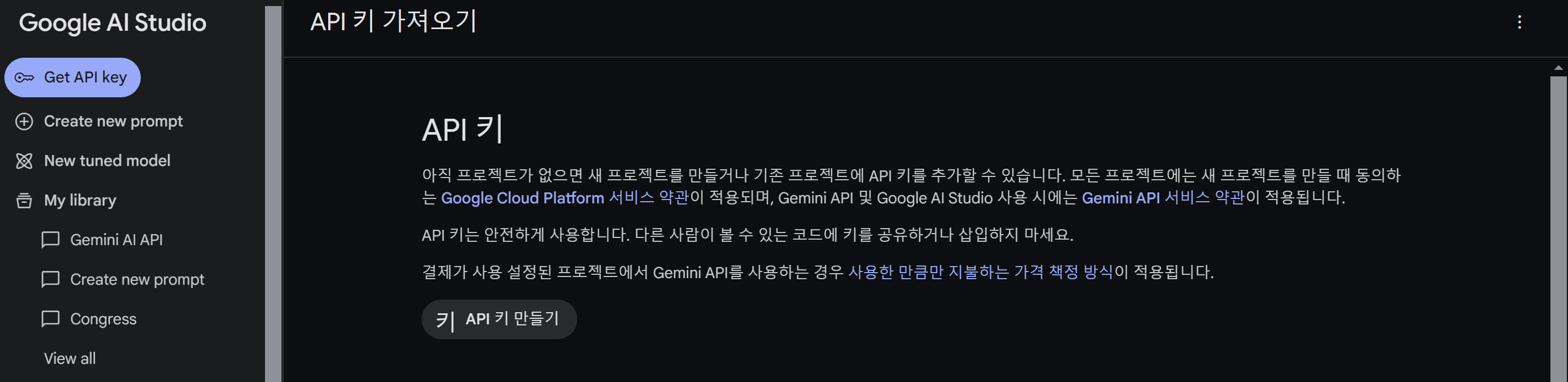 Google AI Studio로 가서 프로젝트를 생성한 후, API 키를 생성한다