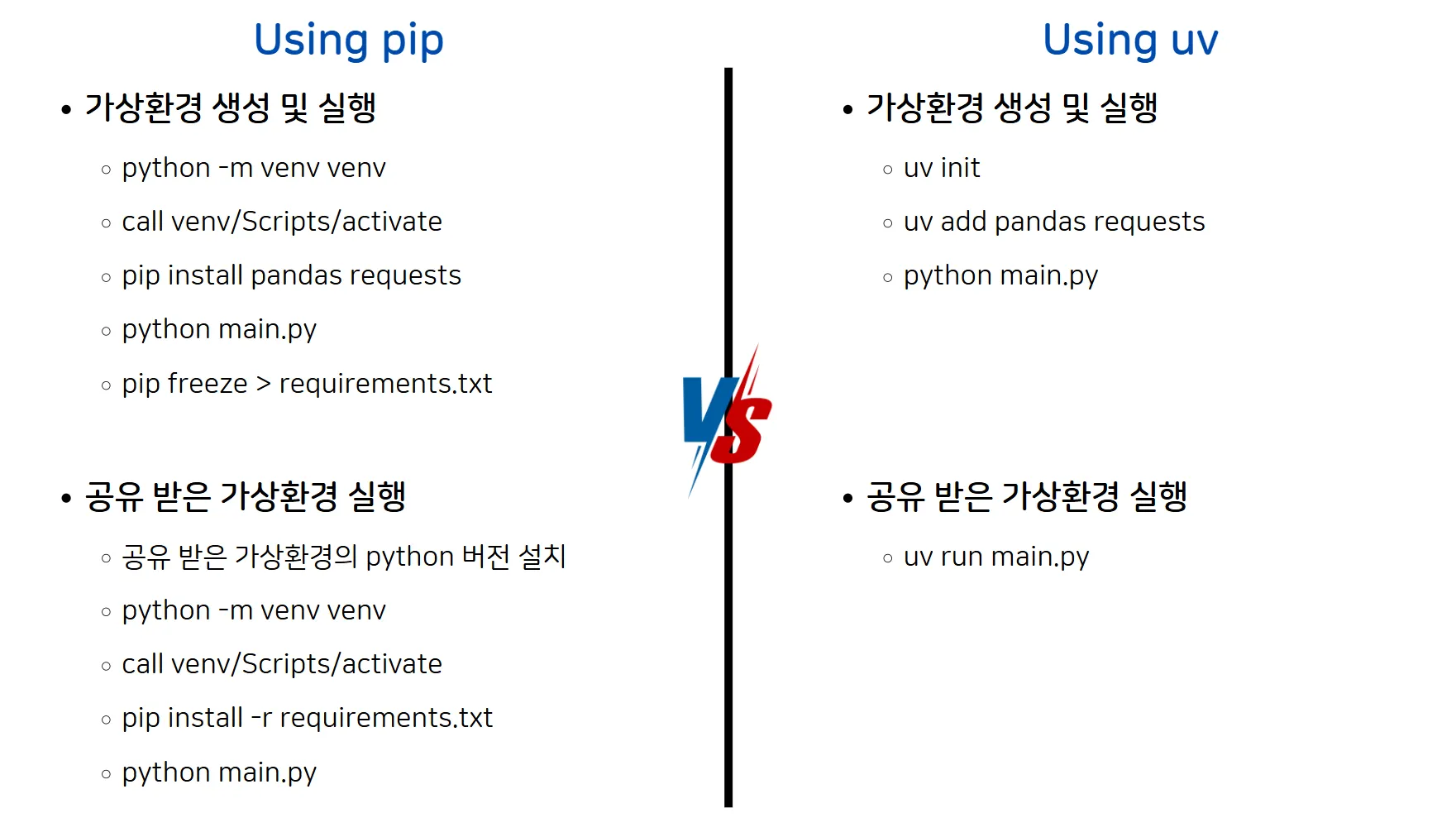 로 설치된 디렉토리와도 높은 호환성을 유지해, 기존 프로젝트를 완전히 갈아엎지 않아도 자연스럽게 도입할 수 있습니다. 이처럼 부담 없이 도입이 가능하면서도 더 나은 개발 환경을 제공한다는 점에서 매우 매력적입니다.uv
