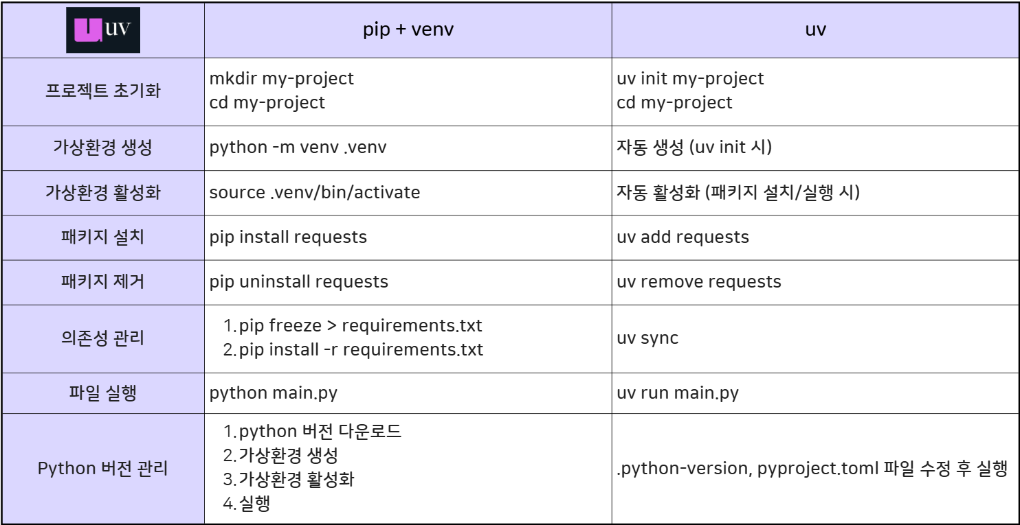 는 이를 보완하고 Python의 패키지 관리를 더욱 효율적이고 빠르게 할 수 있도록 개발된 도구입니다. 특히 Python 버전 관리나 가상환경 설정, 의존성 설치 속도 등에서 uv