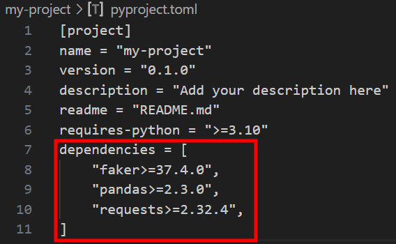 명령어를 통해 설치했던 파이썬 라이브러리들 역시 uv에서는 uv 문법에 맞게 설치 및 삭제를 진행해주어야 합니다.# 패키지 추가