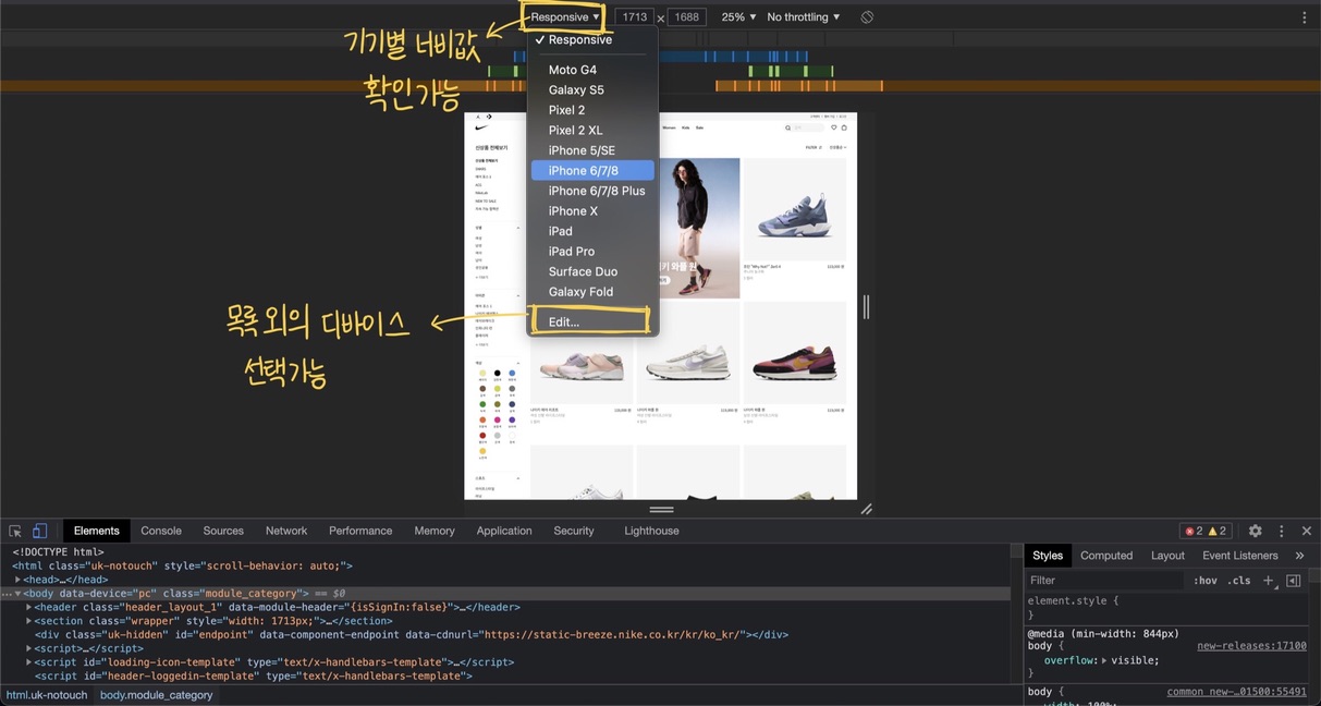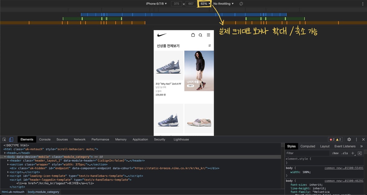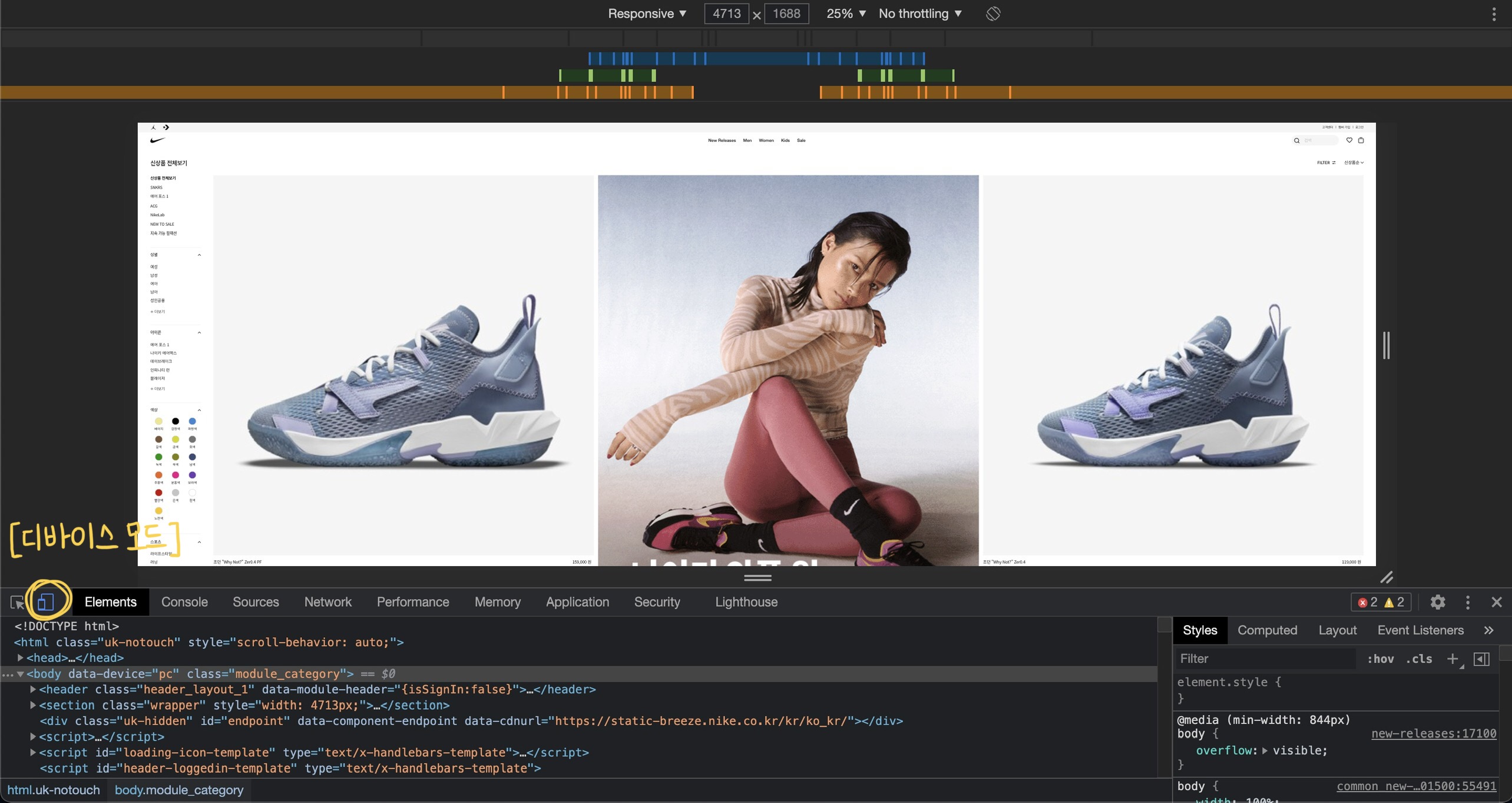 F12로 개발자 도구를 열고 디바이스 모드를 클릭한다.