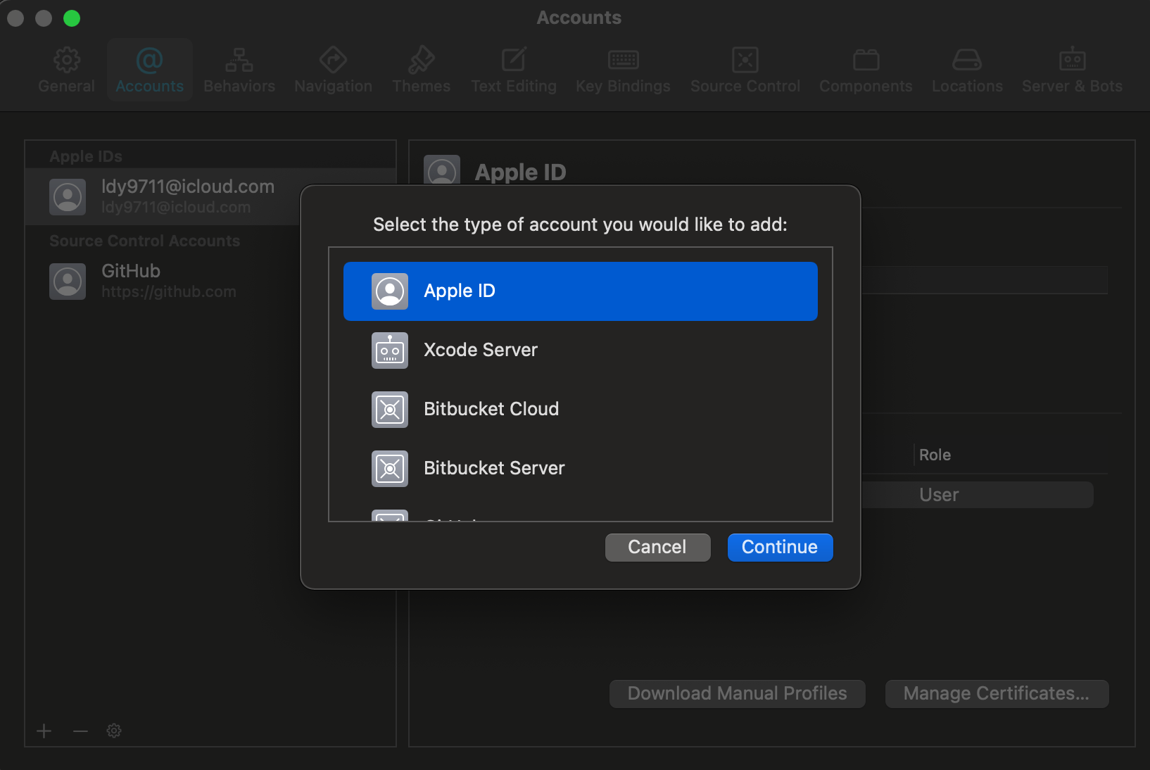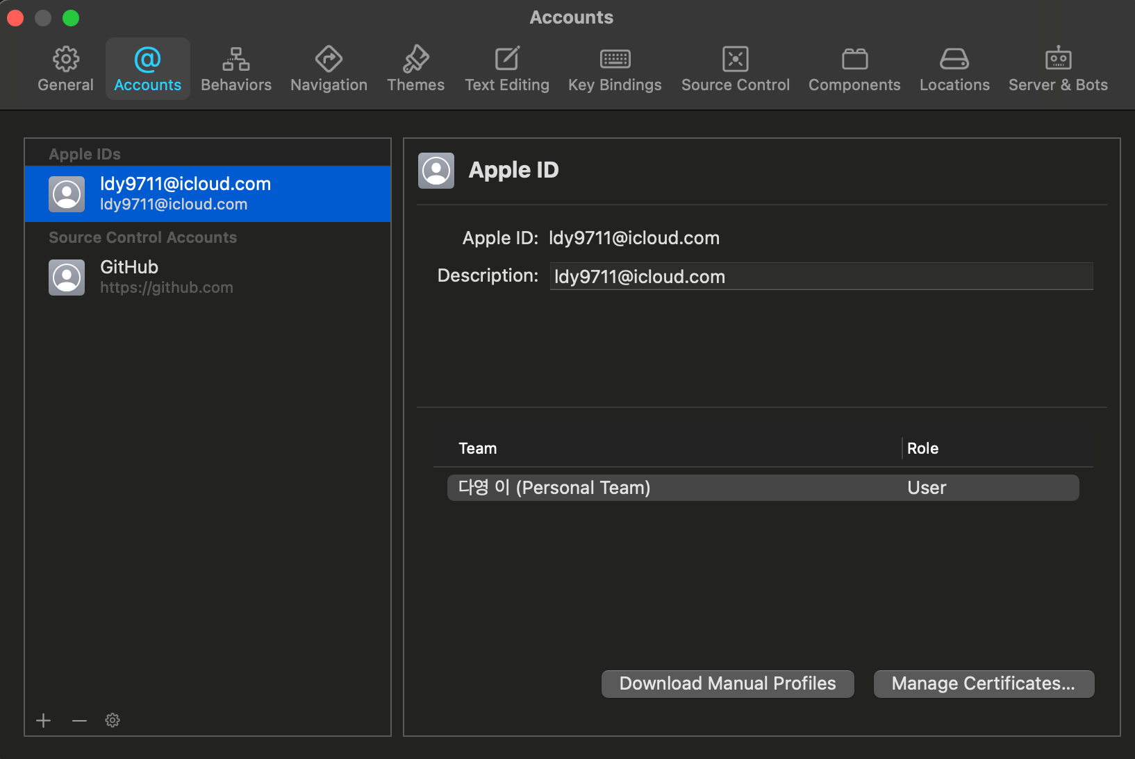 Accounts에서 Apple ID 넣기 (왼쪽 하단 + 버튼)