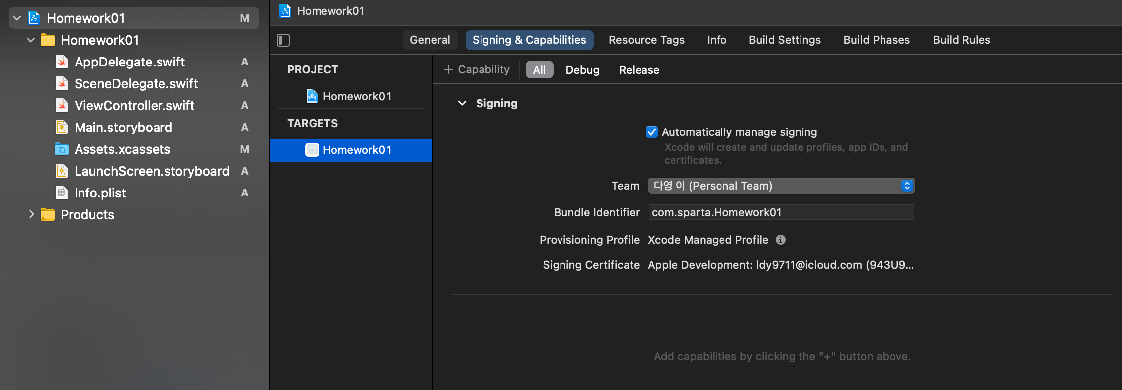 프로젝트 설정 -> Targets에서 해당 앱 -> Signing & Capabilities