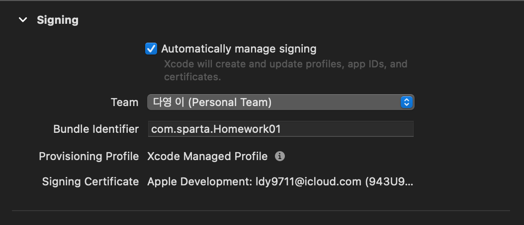 Automatically manage signing 체크 + Team에 로그인한 아이디 선택