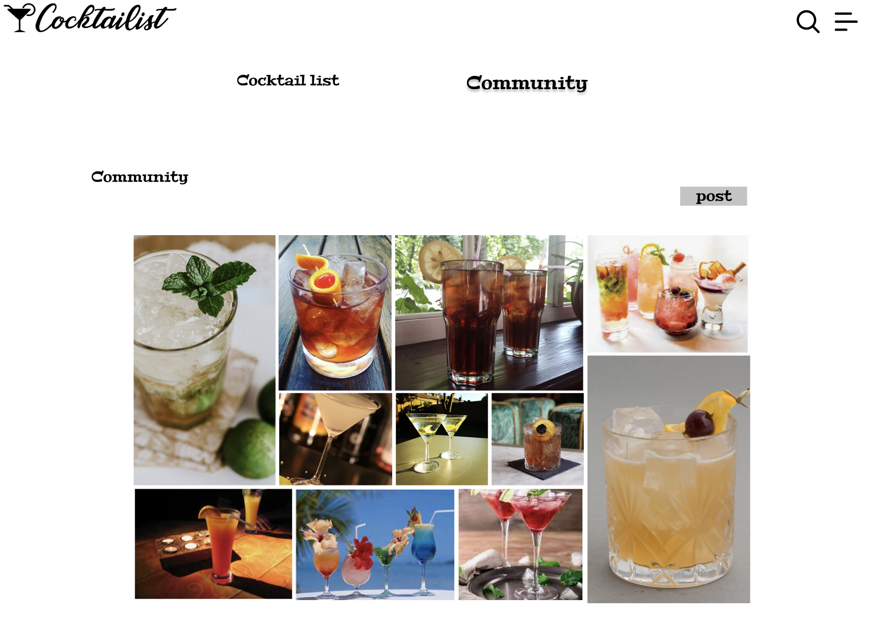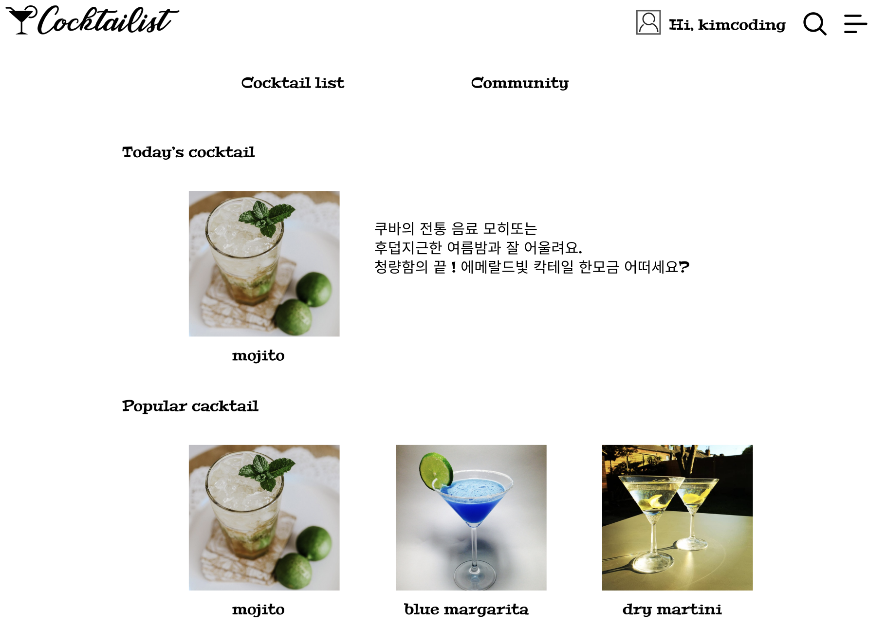 프로젝트 진행 전, 두가지를 추가로 해야했다. 1.프로젝트명과 2.팀명 선정이었다. 우리 웹의 이름은 Cocktailist이었다. Cocktail에 List를 더한 합성어로, 칵테일 목록을 보여주고 추천해주는 웹페이지를 만드려 했다.
