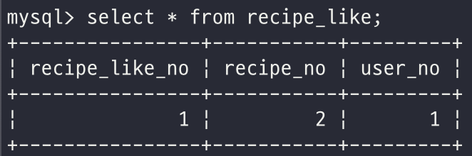 이제 1번 사용자가 2번 레시피, 3번 레시피를 각각 조회했을 때 recipe_like_status 값을 확인한다.