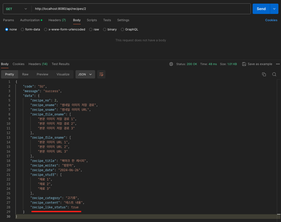 먼저 2번 레시피를 조회했을 때이다. 예상대로 recipe_like_status의 값이 true로 나왔다.