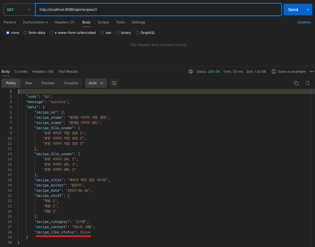 다음은 3번 레시피를 조회했을 때이다. 역시 예상대로 recipe_like_status의 값이 false로 나왔다. 정상적으로 작동하는 것을 확인할 수 있다.