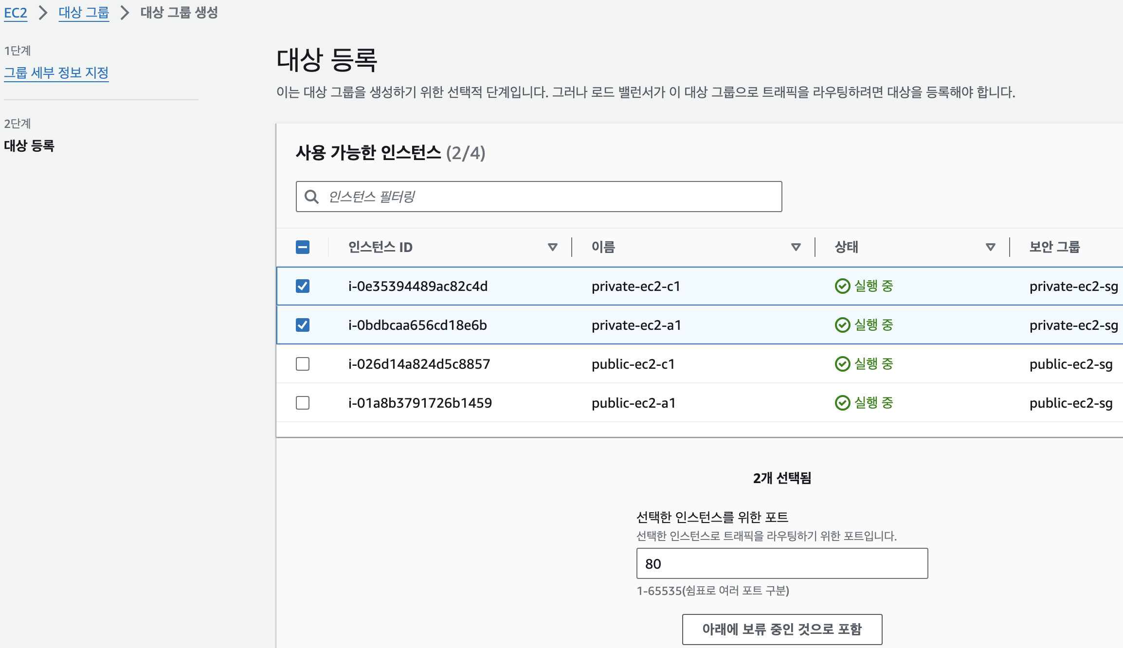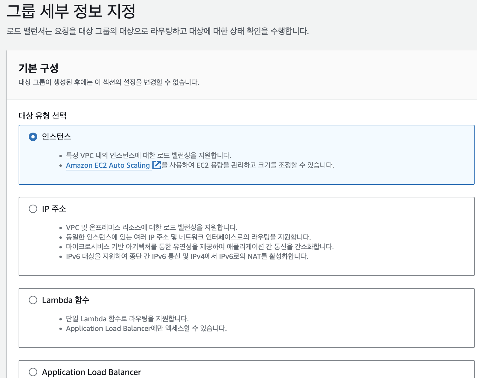 : 대상의 유형(Instance, Load Balancer, IP 주소), 작업 중인 VPC 선택, 프로토콜 버전 등을 지정한다.