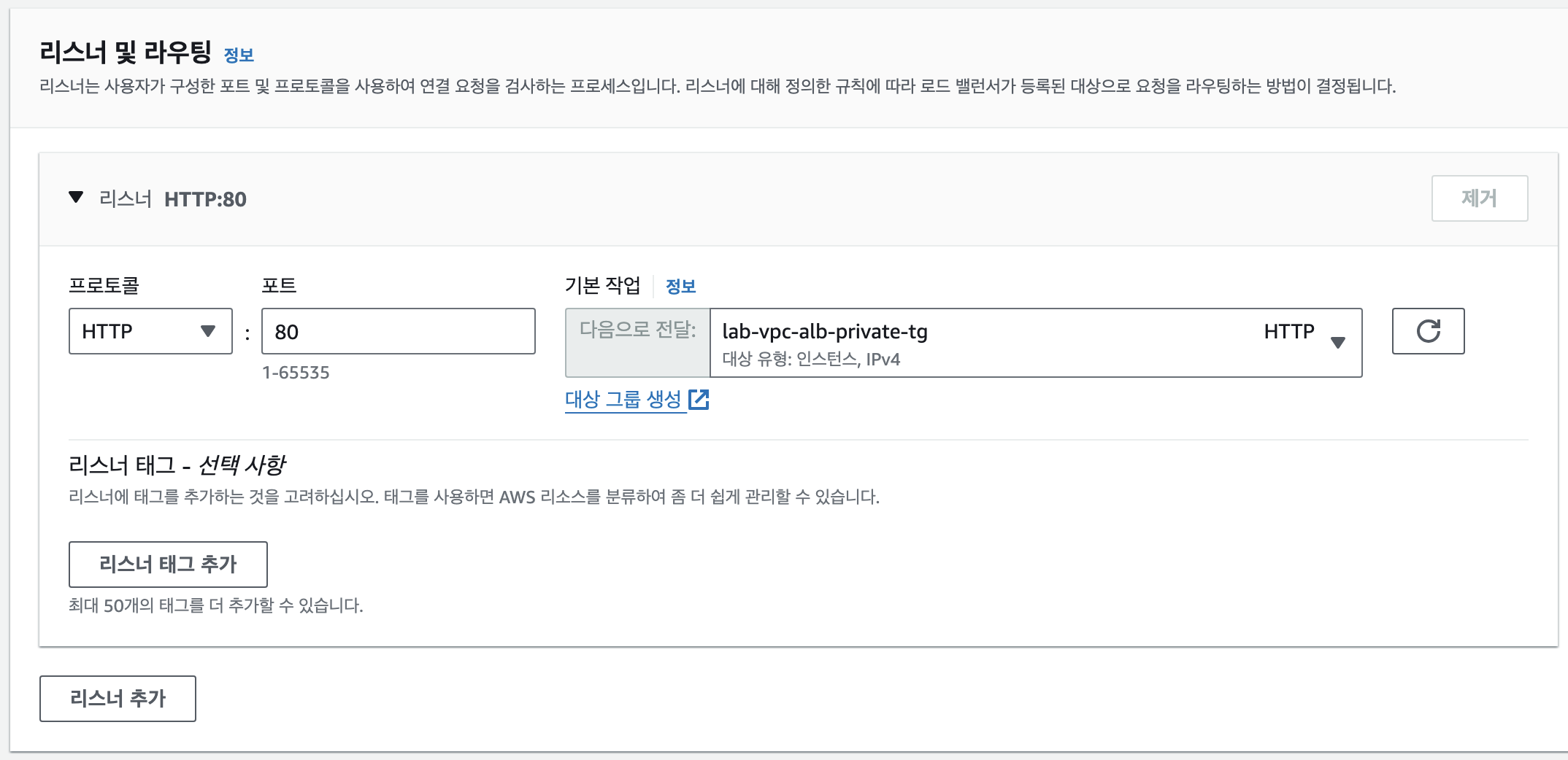 : 로드밸런서와 타겟이 되는 EC2 사이에서의 통신에 대한 프로토콜과 포트를 지정하는 것- 로드밸런서 생성 시 Listner and routing 부분에 프로토콜과 포트를 설정하는 것