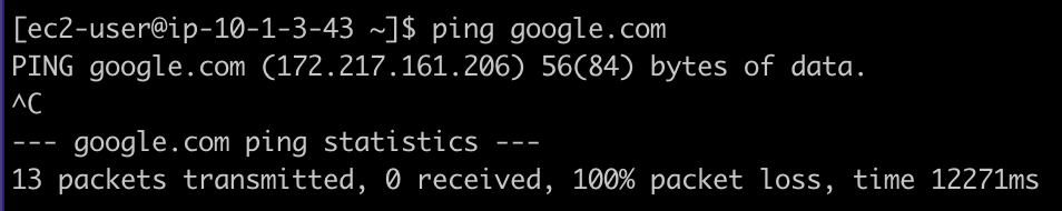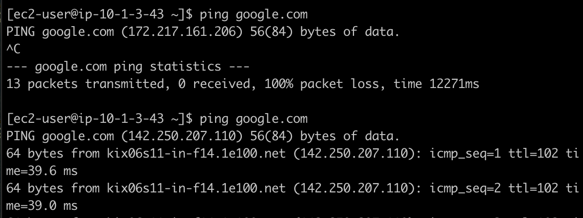 NAT Gateway 설정 전 (통신이 안되는 것을 볼 수 있음)