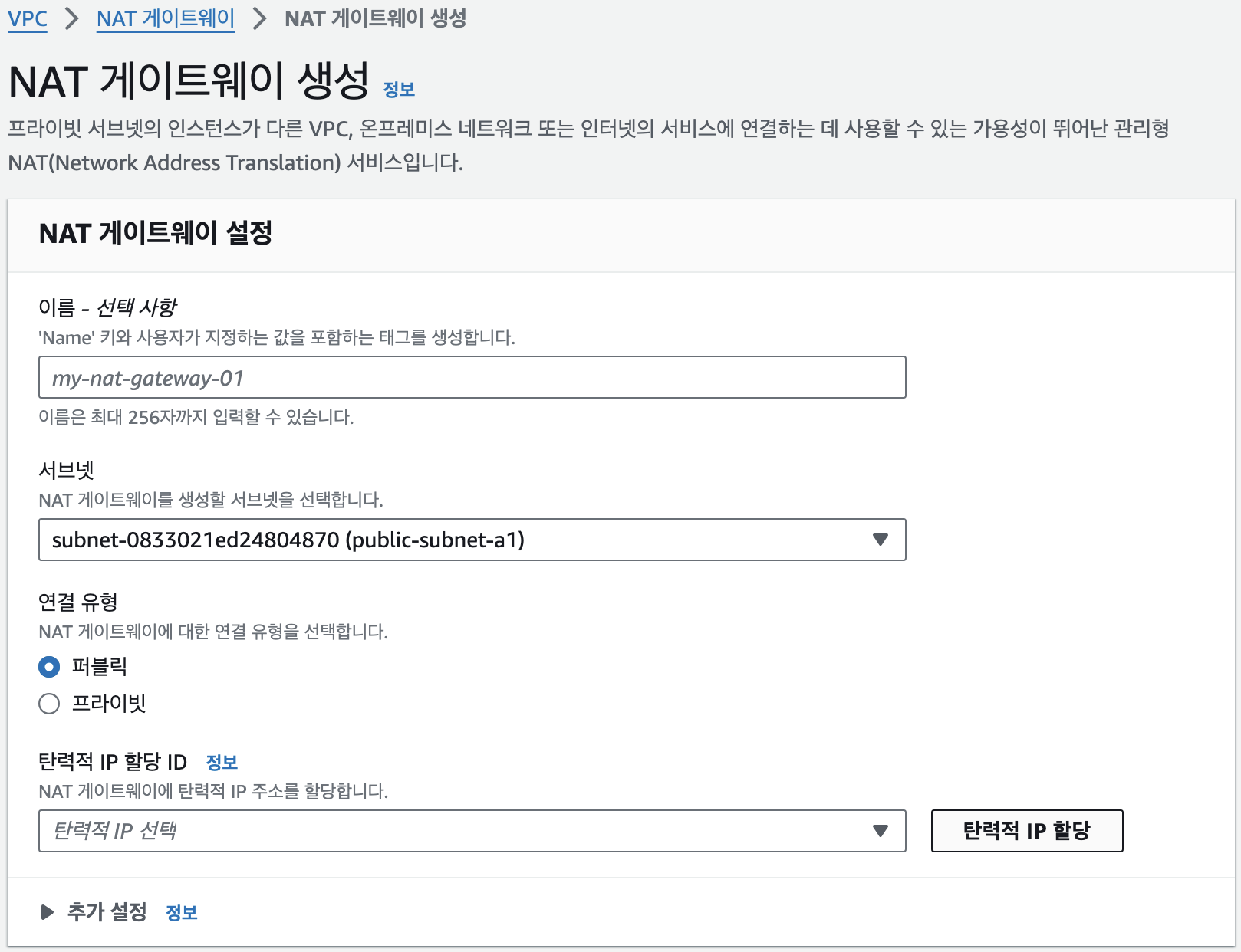 1. 간단하게 NAT Gateway를 생성할 subnet을 설정하면 된다. (public 서브넷 선택).