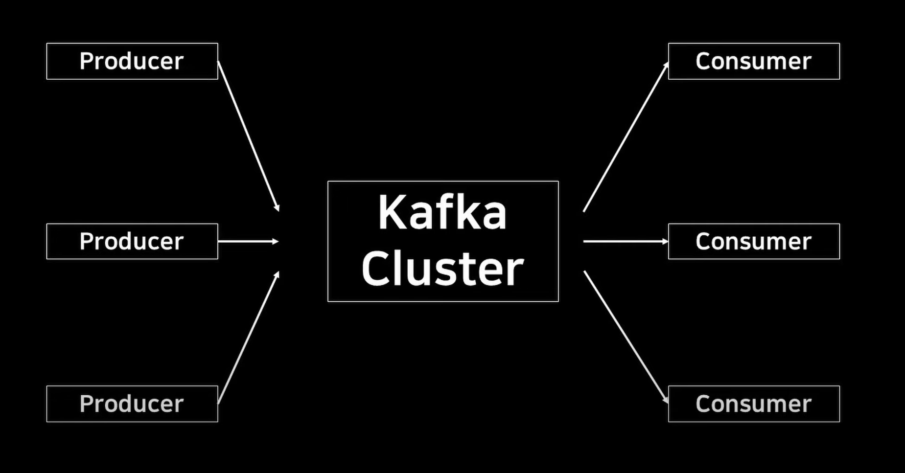 💡 우선 개괄적인 이미지를 그려보자면, 카프카를 사용하는 시스템은 크게 세 가지의 구조로 이루어진다. Producer, Kafka Cluster, Consumer이다.