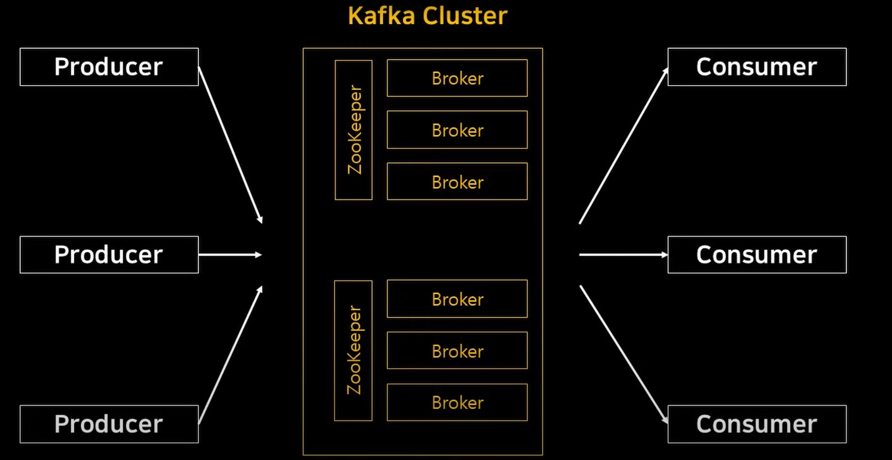개괄적으로 그려본 이미지에서는 처리해야 하는 데이터를 쌓아두고 관리하는 곳을 Kafka Cluster라고 묶어 얘기했으나, 실질적으로 카프카 클러스터는 크게 Zookeeper와 Broker로 이루어져 있다.