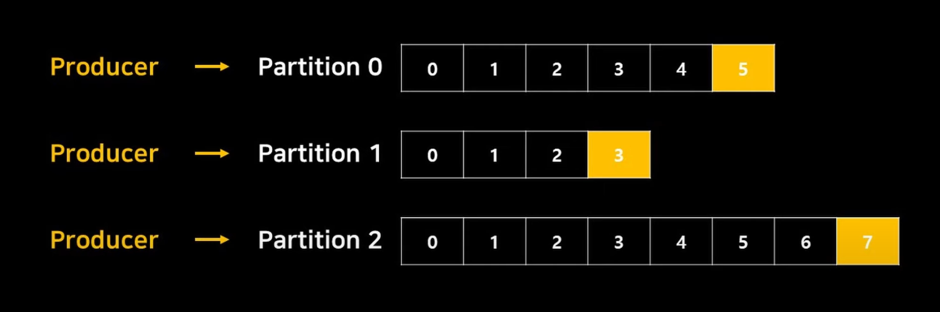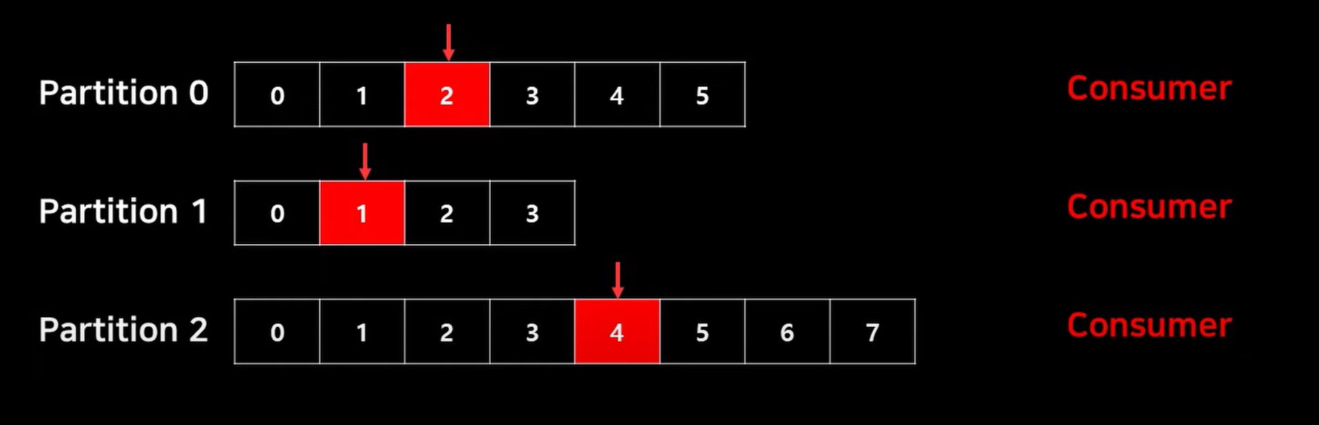 이벤트가 토픽에 들어오면 뒤에 append 형식으로 파티션이 추가되며, offset을 할당받게 되어 이 offset이 메시지를 식별할 수 있는 유니크한 값이 된다. 이 offset을 기준으로 데이터는 순차적으로 컨슈머에 의해 처리된다.