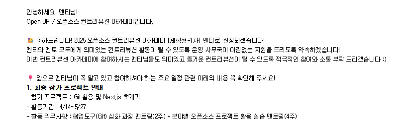 오픈소스 컨트리뷰션 아카데미는 오픈소스 문화를 직접 경험할 수 있는 멘토링 프로그램으로, 체험형/참여형으로 나누어져 있습니다. 이 중 체험형은 예비/초급 개발자를 위한 프로그램이에요. 공식 홈페이지에 들어가면 과거 후기나 모집 안내 자료가 잘 정리되어 있습니다.