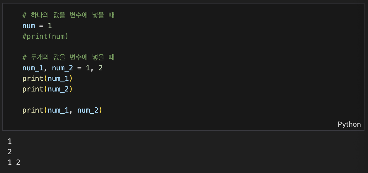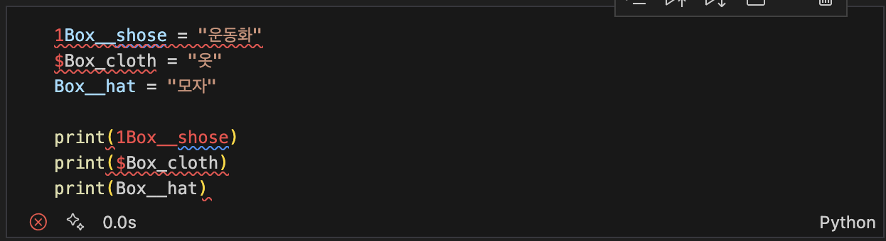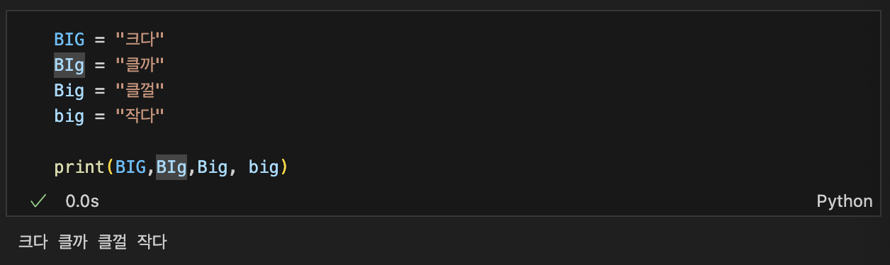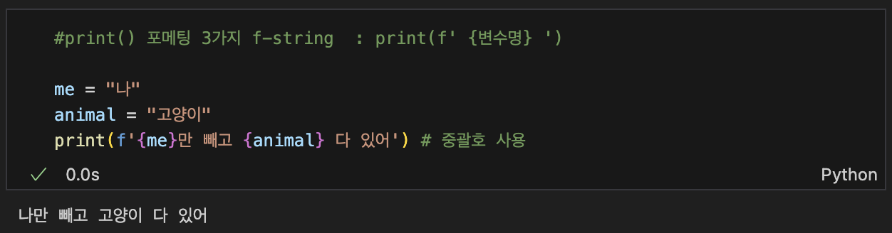 snake_case : _ 필수camelCase : C 대문자 필수print(f' {변수명} ')