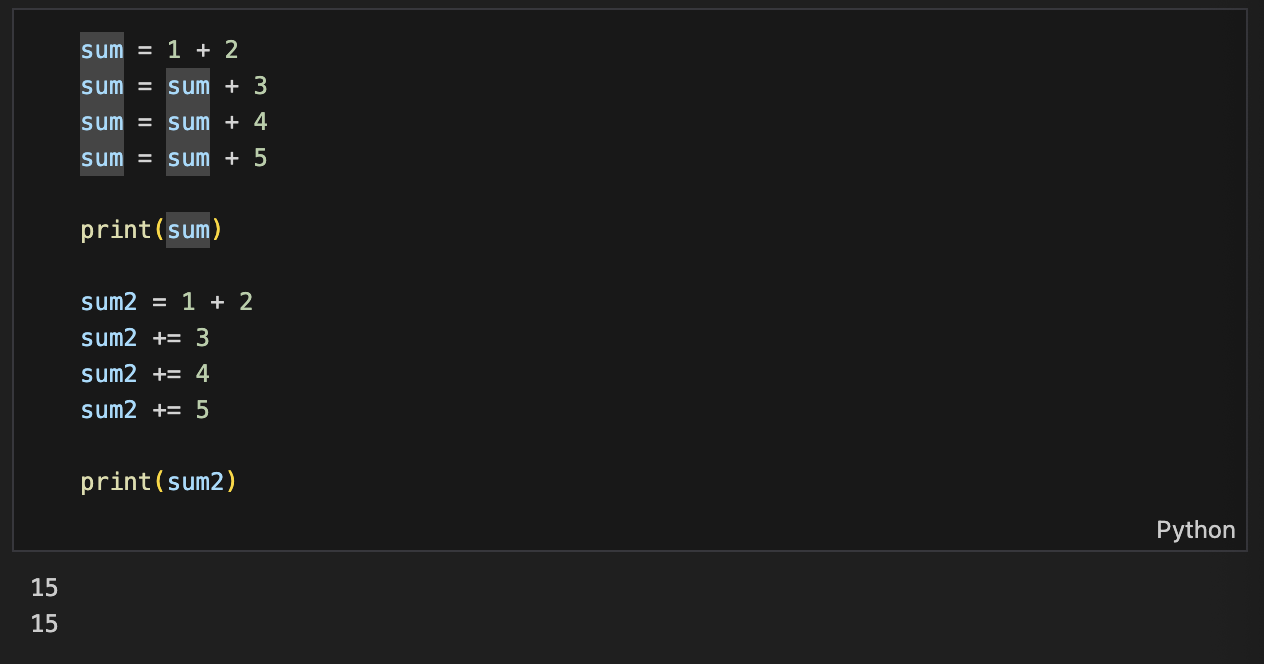 sum = 1+2 (변수선언) -> sum=sum+3 과 sum +=3 동일