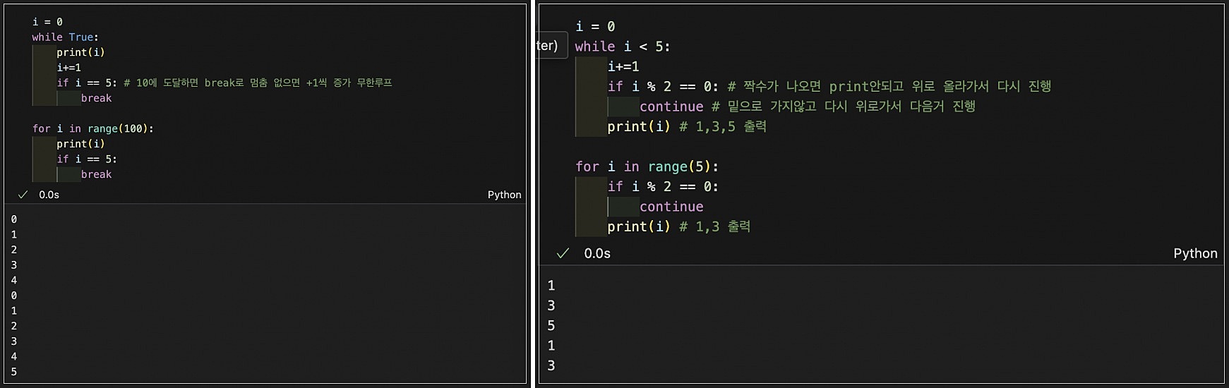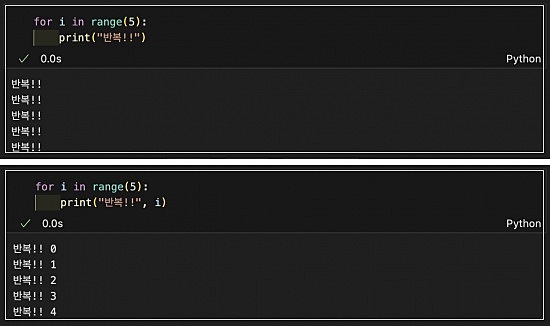 - i+= 1 (변환식) (없으면 무한루프에 빠짐, 계속 증가하다가 조건을 넘으면 멈춤)