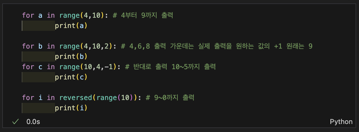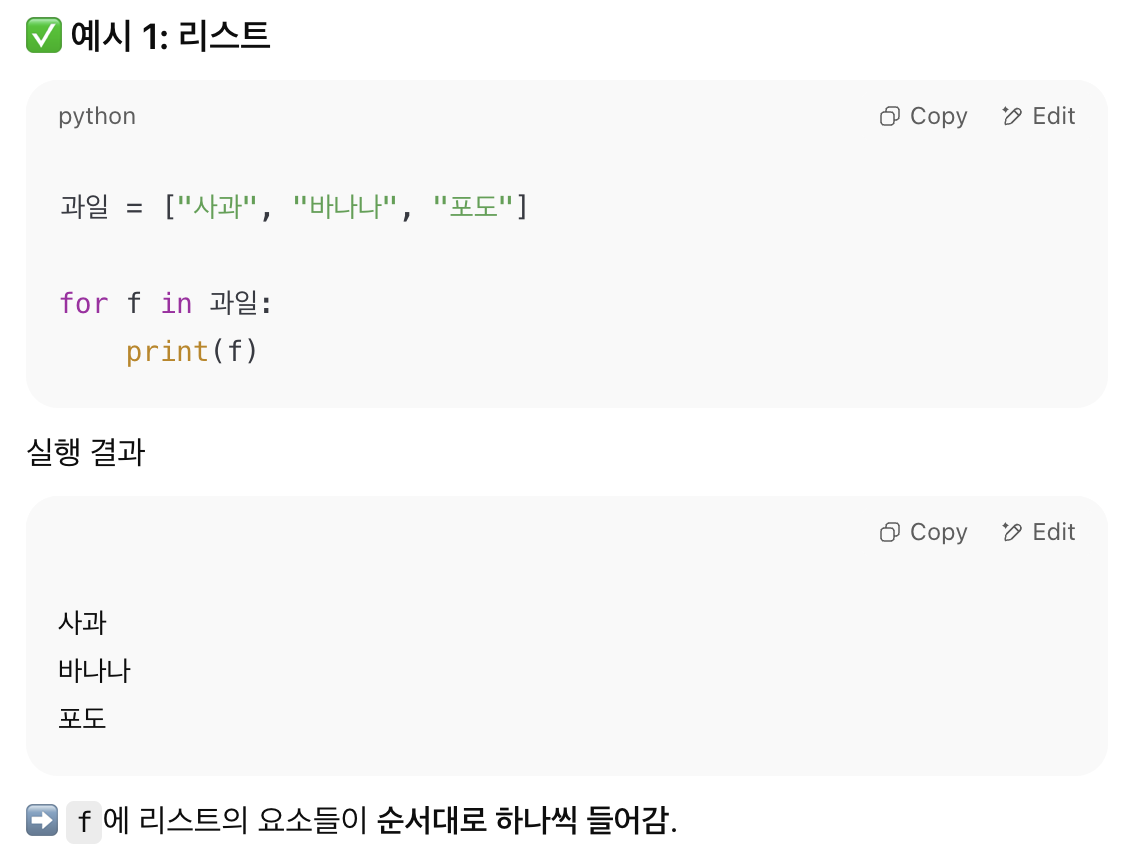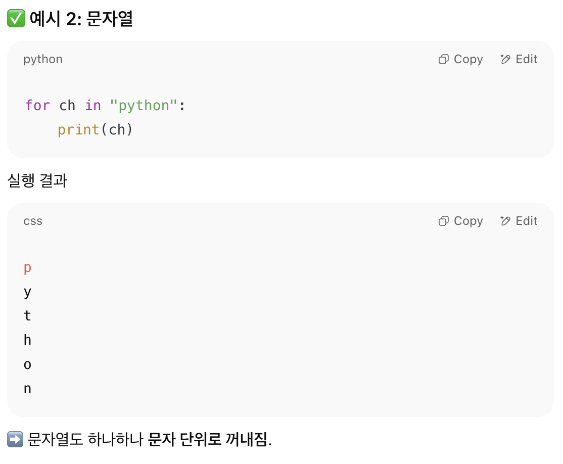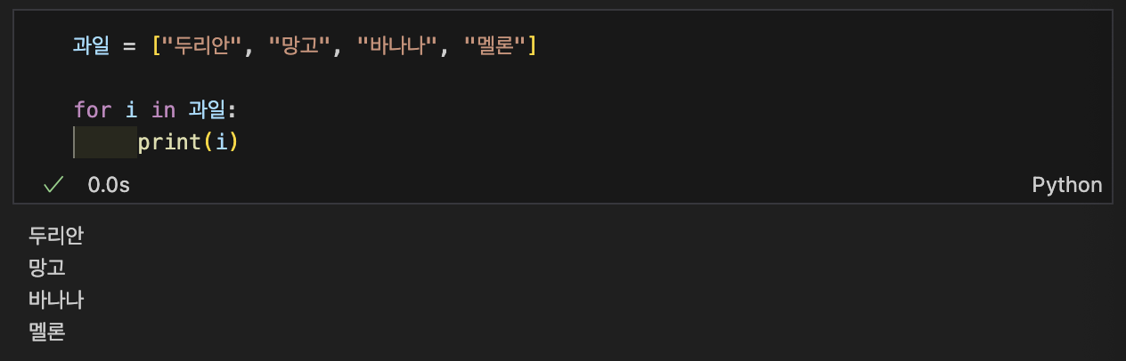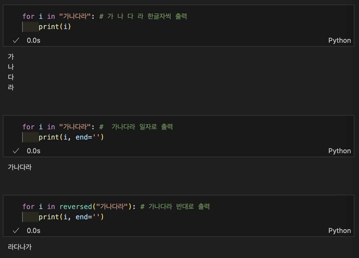 for 변수명 in 반복가능한객체: : 변수명자리에 반복가능한객체 안에 있는 값들이 차례대로 들어가는 것