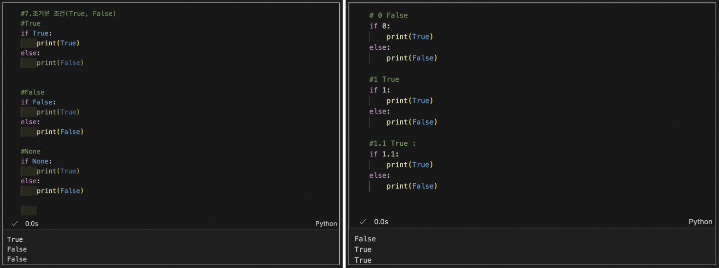 - 0 : False / 0이 아닌 모든 숫자 : True (0.9:True)