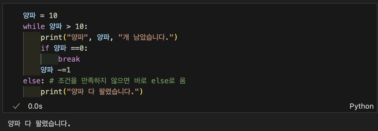 - while 의 조건을 만족하지 못하면 바로 else에 있는 내용이 출력됨
