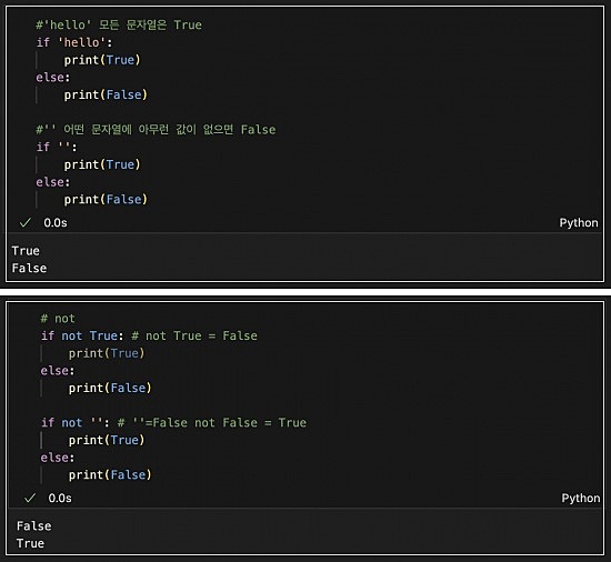 - 'hello' : 모든 문자열은 True / '': 문자열에 아무런 내용이 없으면 False