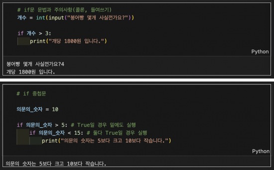 - if 뒤에 ":(콜론)"을 붙여야 한다. (