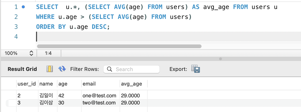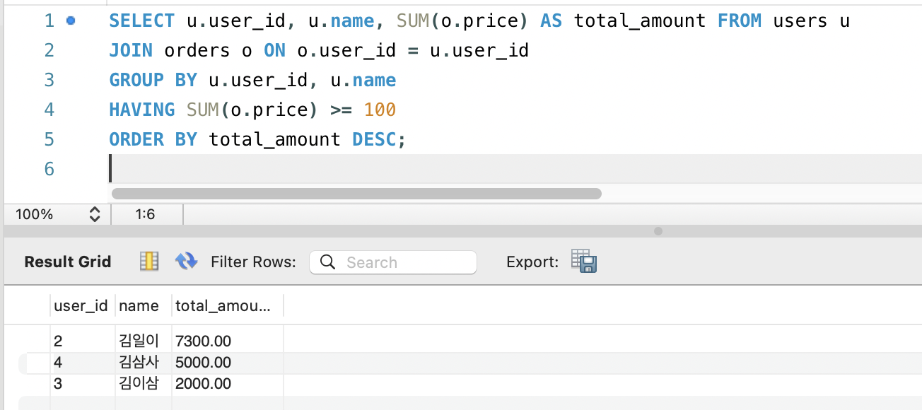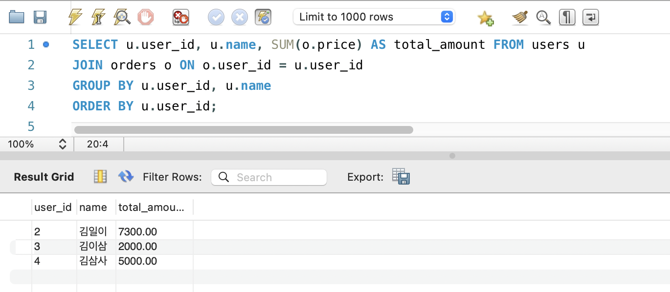 - ORDER BY u.user_id; : user_id가 작은 것부터 큰 것 순서로 결과를 보여달라는 뜻