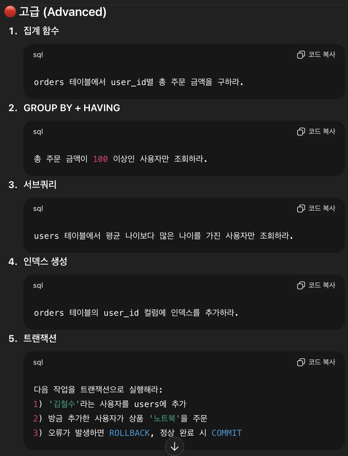 - HAVING 은 GROUP BY 결과(집계 결과)에 조건을 걸 때 사용하는 구문