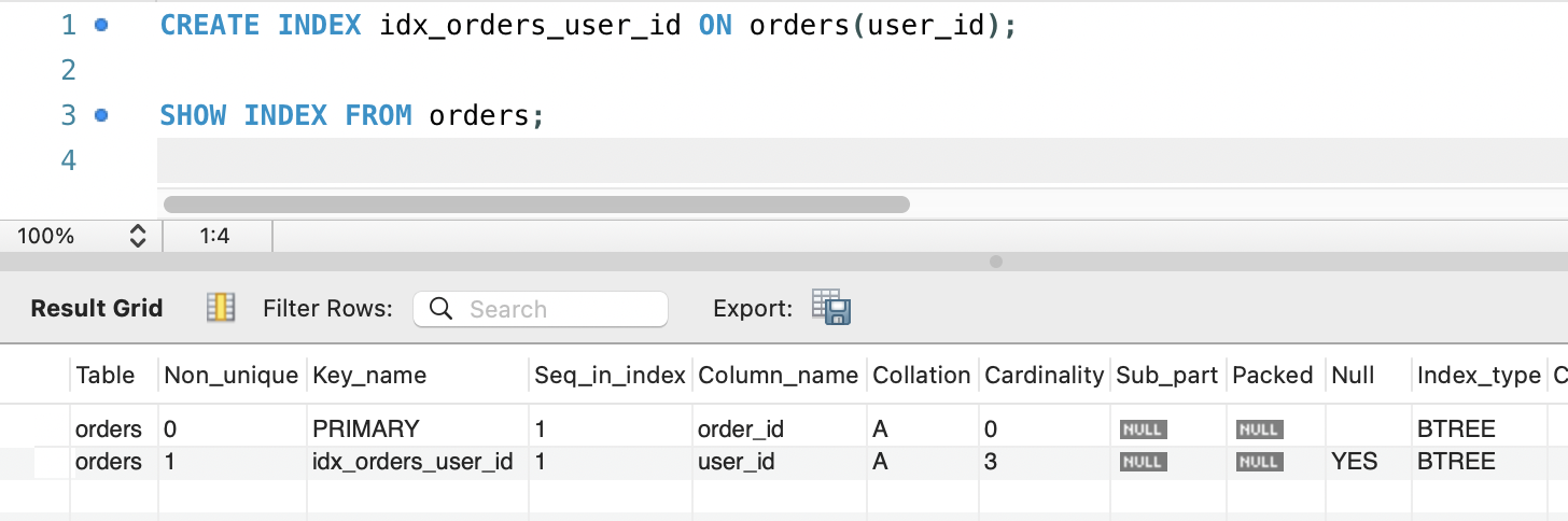 - orders 테이블의 user_id 컬럼에 인덱스를 생성하는 것