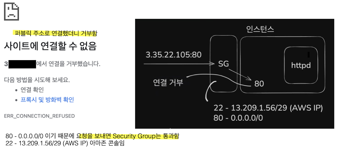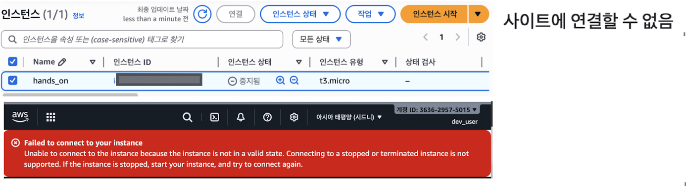 인스턴스를 중지 했기 때문에 퍼블릭 아이피로 접속 안됨
