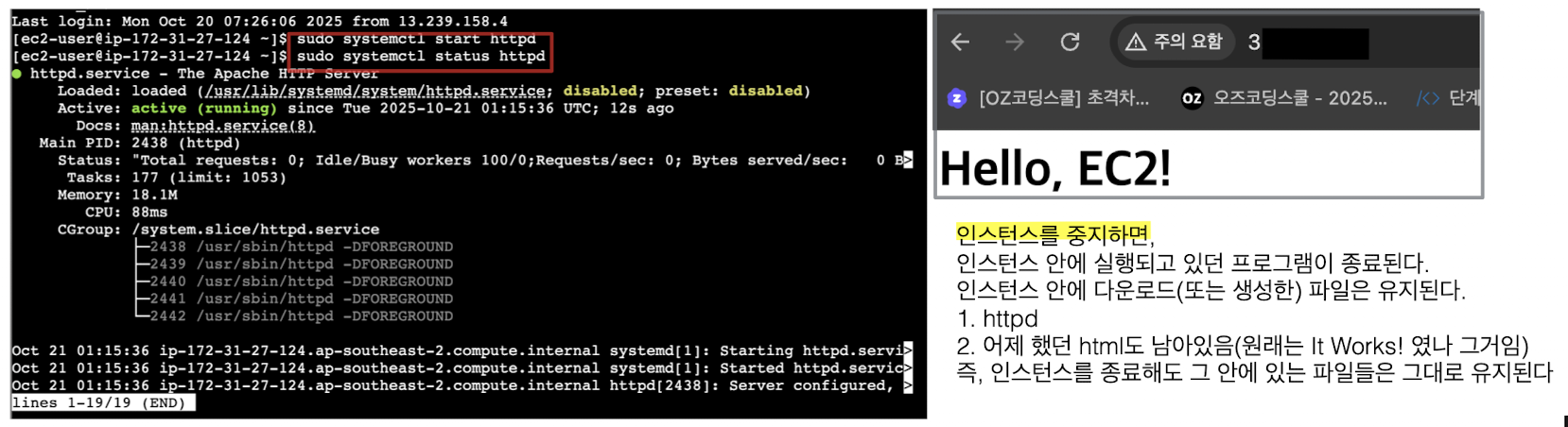 systemctl = 아마존 리눅스 상의 프로세스를 관리하는 프로그램, 실행 중이던 프로그램의 관리 가능sudo systemctl enable httpd : 컴퓨터가 재시작 될 때, httpd 재시작