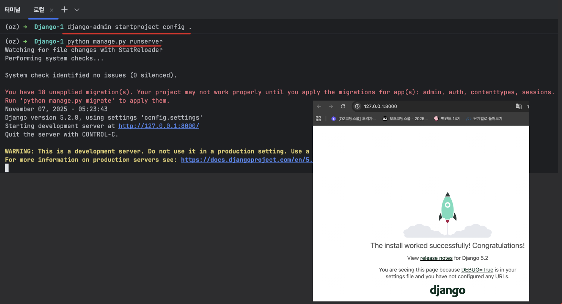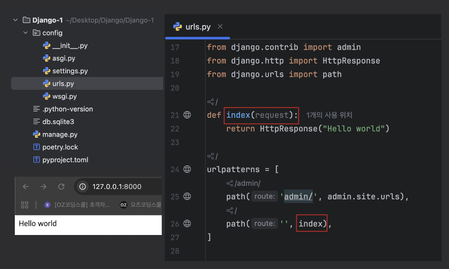 └── urls.py : url 설정들. 기본적으로 admin만 설정되어있다.