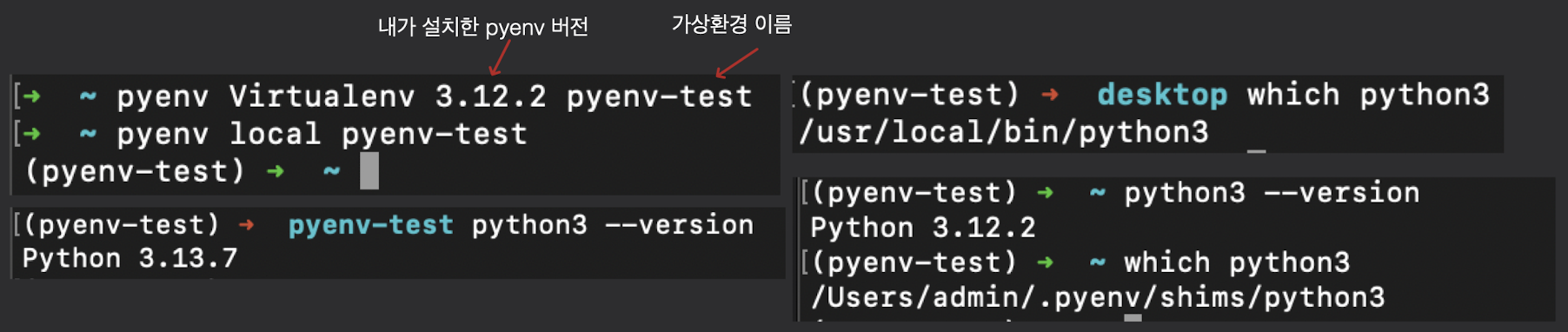 | 가상환경 생성 | pyenv virtualenv | Pyenv 버전 기반 venv 생성 |