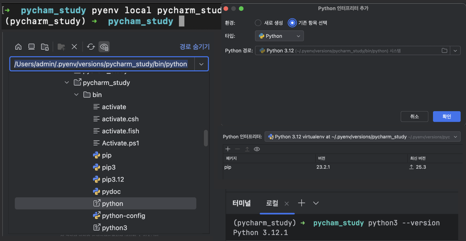 - Users > 로그인하는 유저 > .pyenv > versions > pycharm_study > bin > python