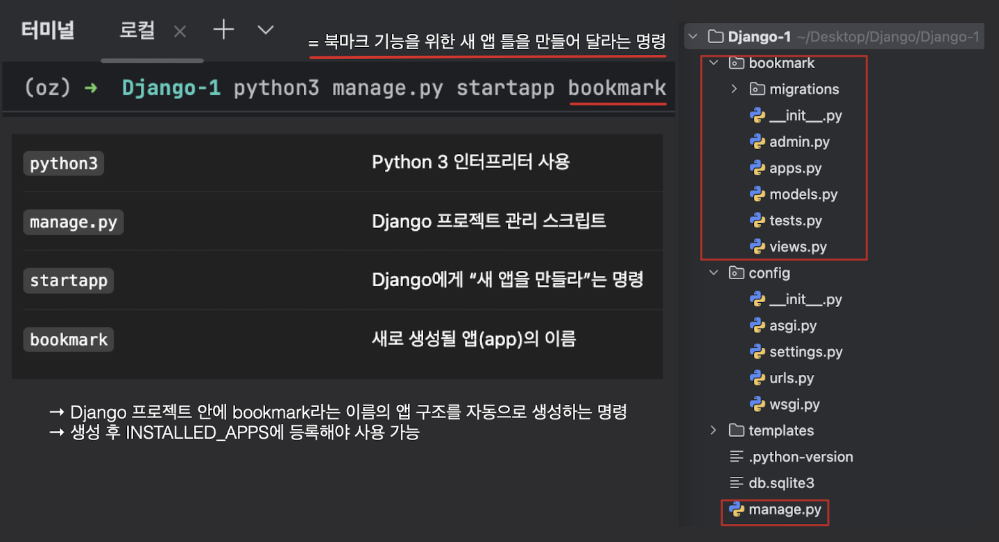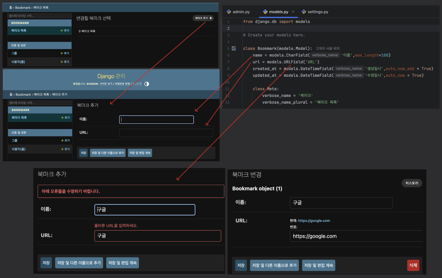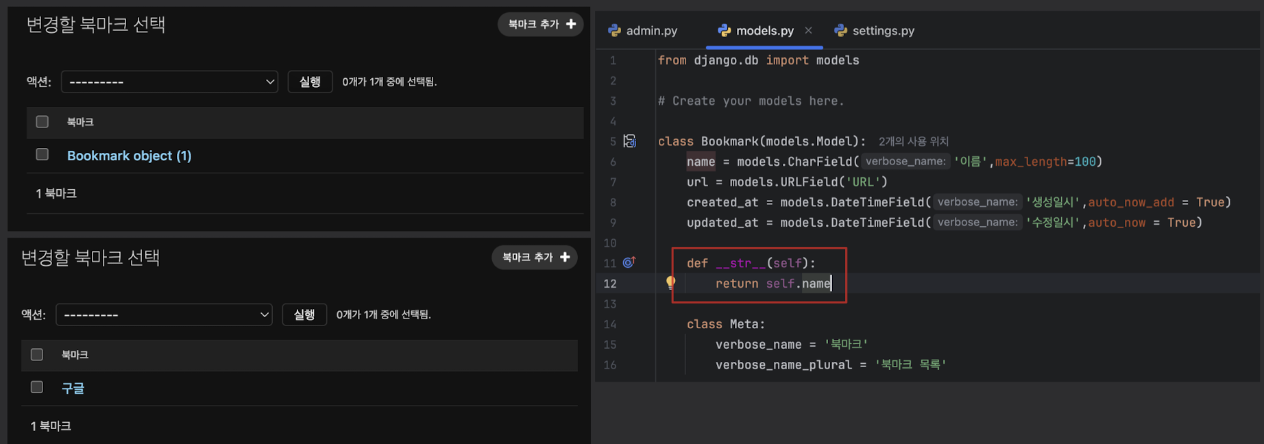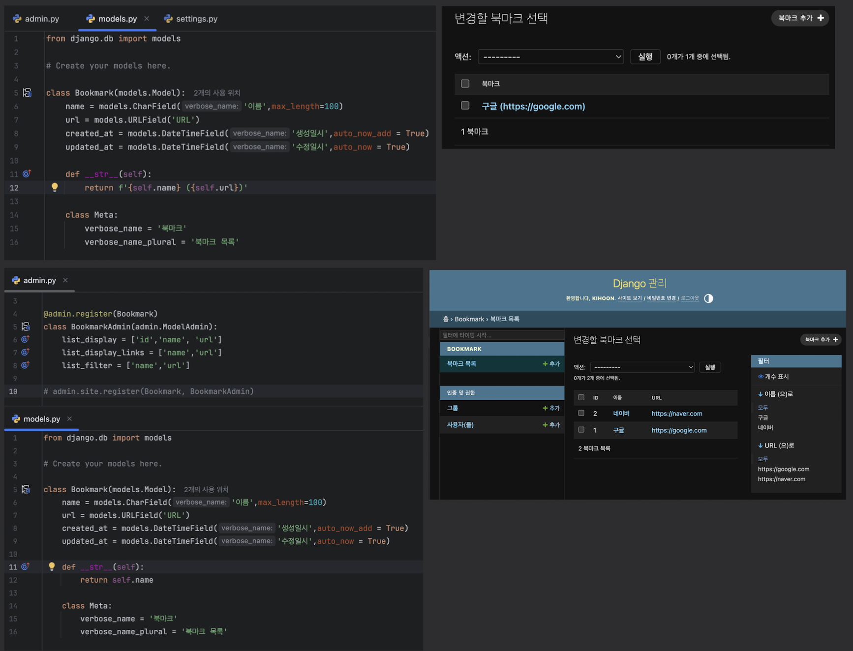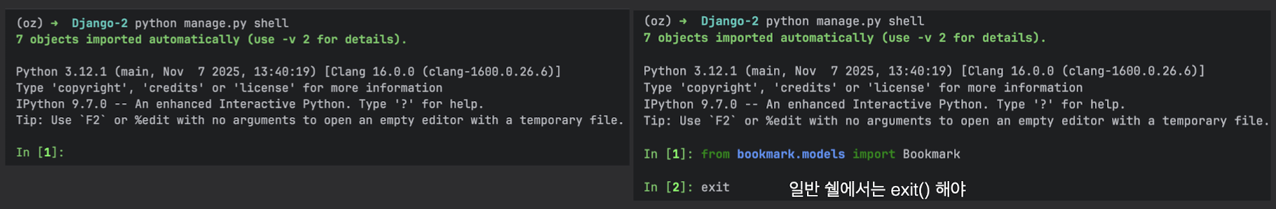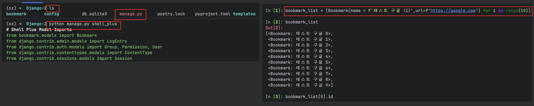 python manage.py shell_plusls 했을때 manage.py가 나오는가 Bookmark.objects.create(name='이름',url='https://~~.com')# Shell에서