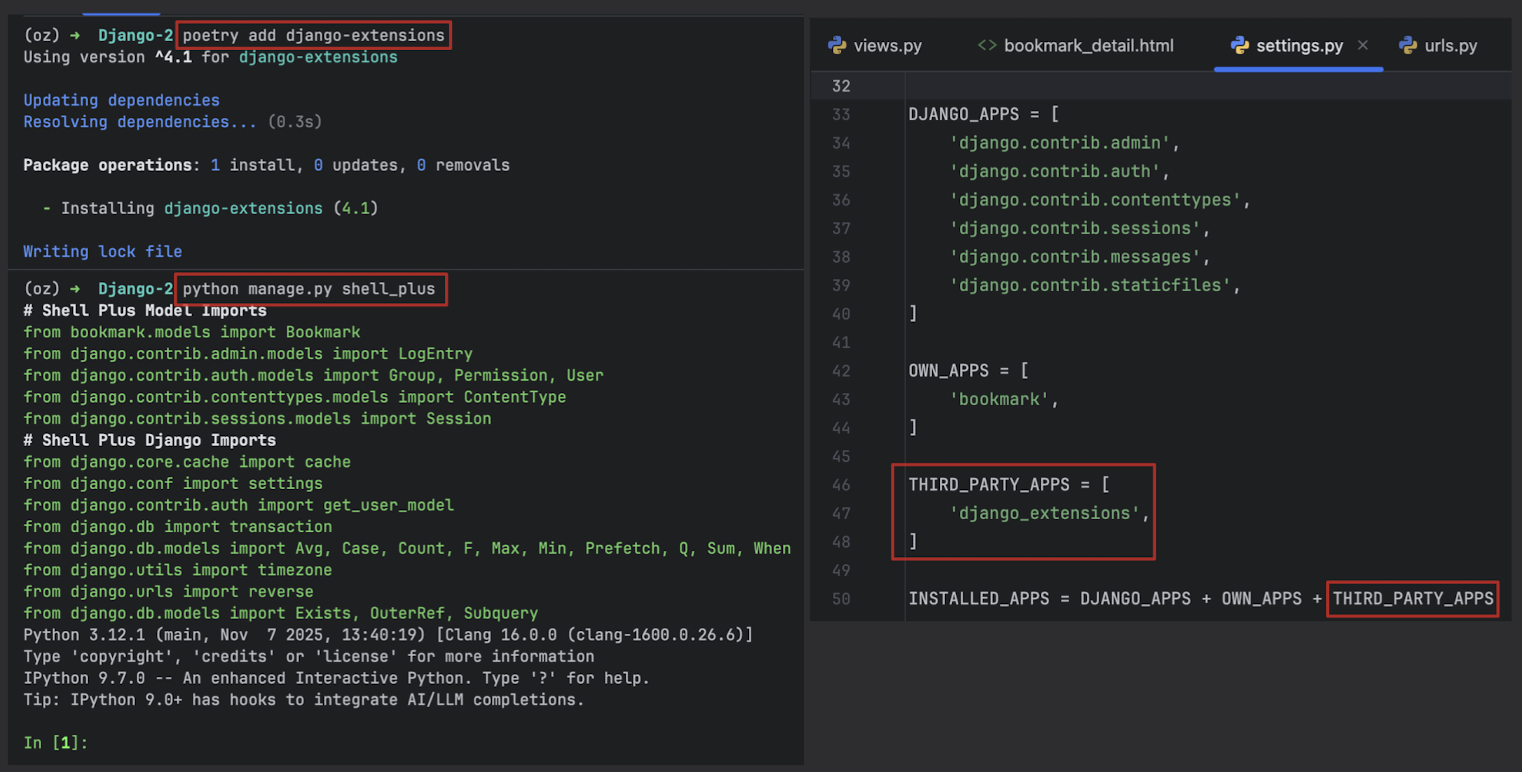 poetry add django-extensions : 여러가지가 한번에 임포트 됨