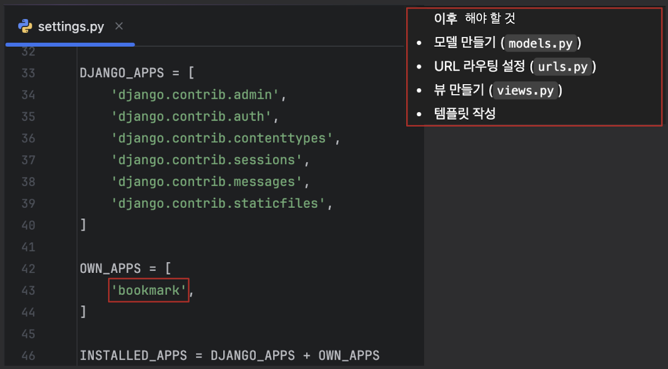 INSTALLED_APPS 를 DJANGO_APP 과 OWN_APPS 로 분리