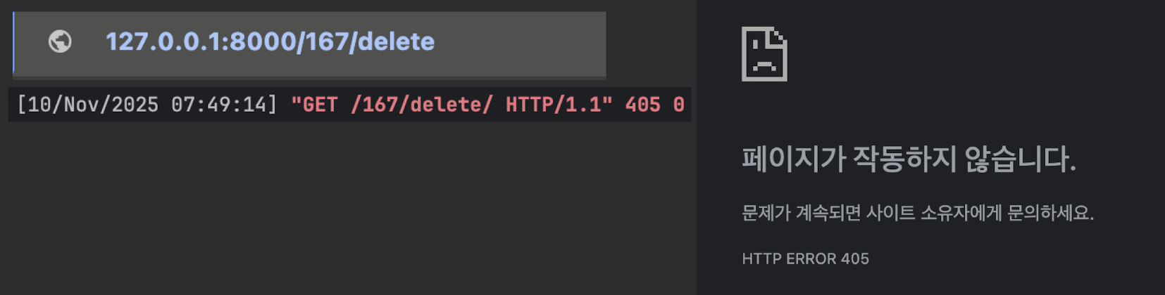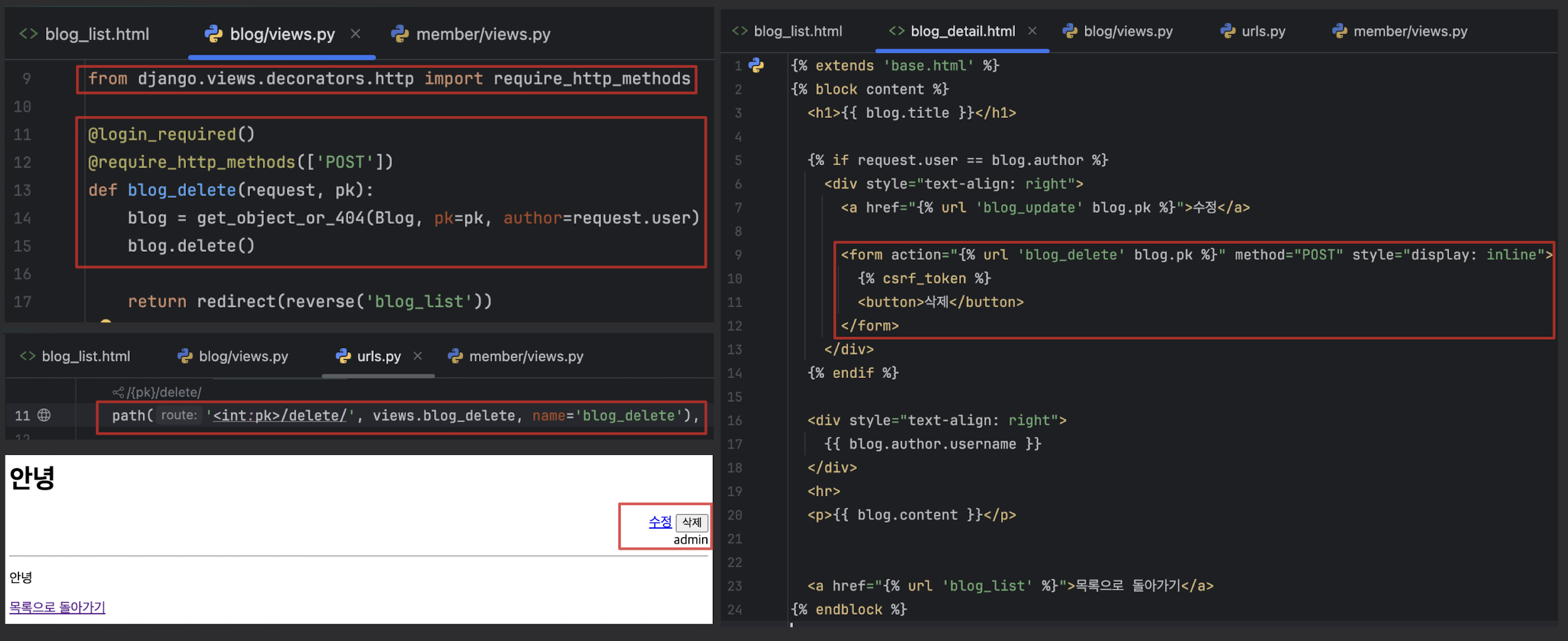 - 삭제 요청은 꼭 POST요청으로 받아야 함 / GET는 안됨