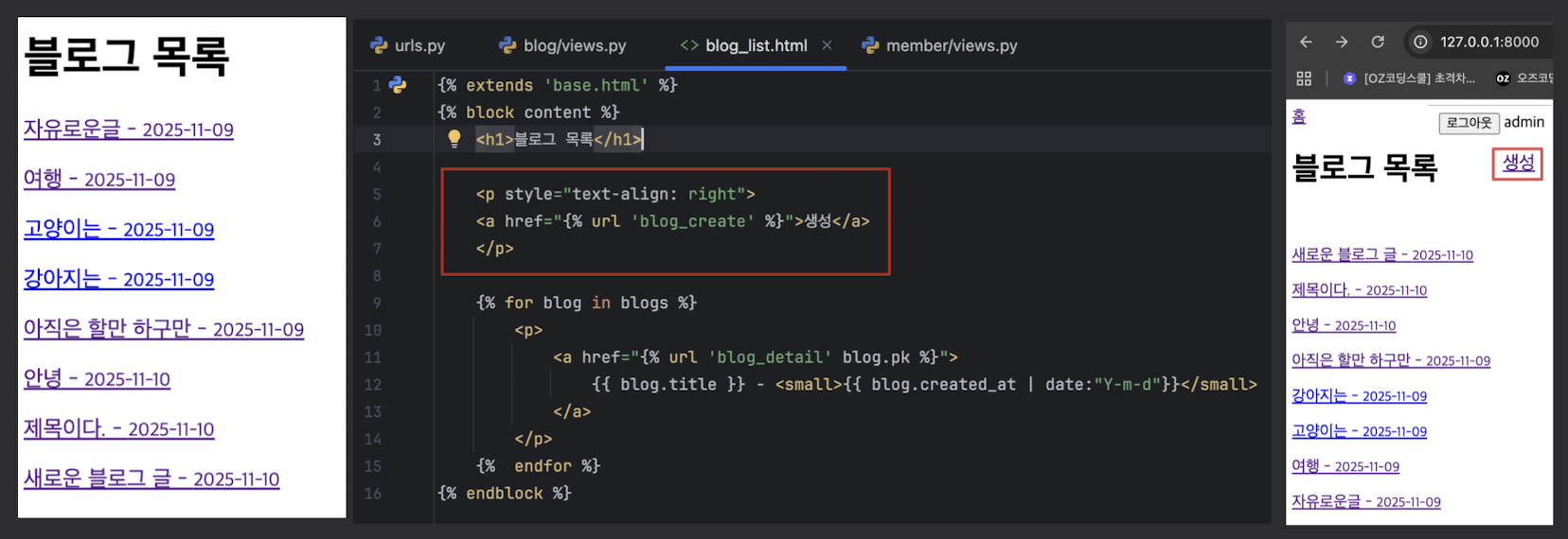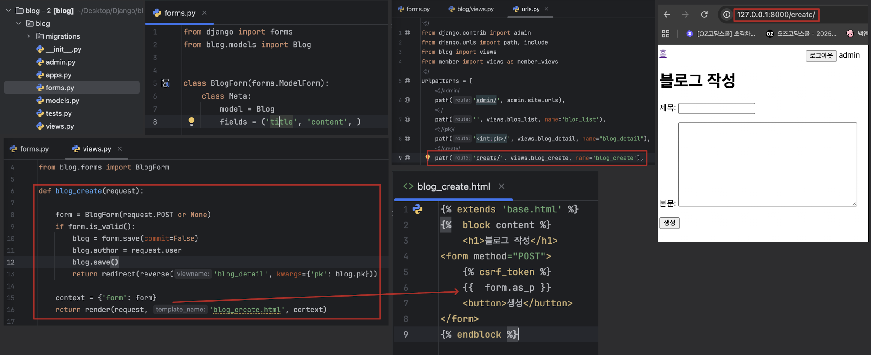 - blog_create.html 템플릿을 렌더링해서 사용자에게 폼을 보여줌