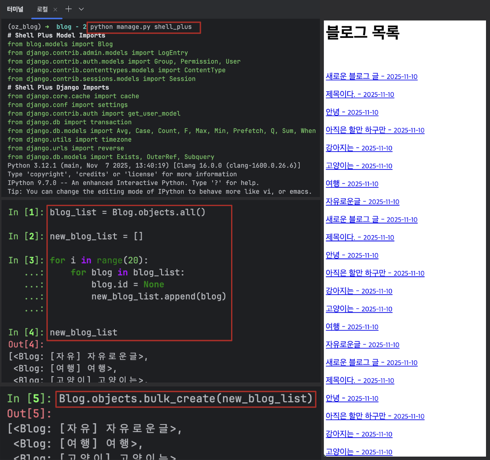 - 실제로 DB에 저장, 이제 새 블로그 글이 생성되고 blog.pk(기본키, ID)가 생김