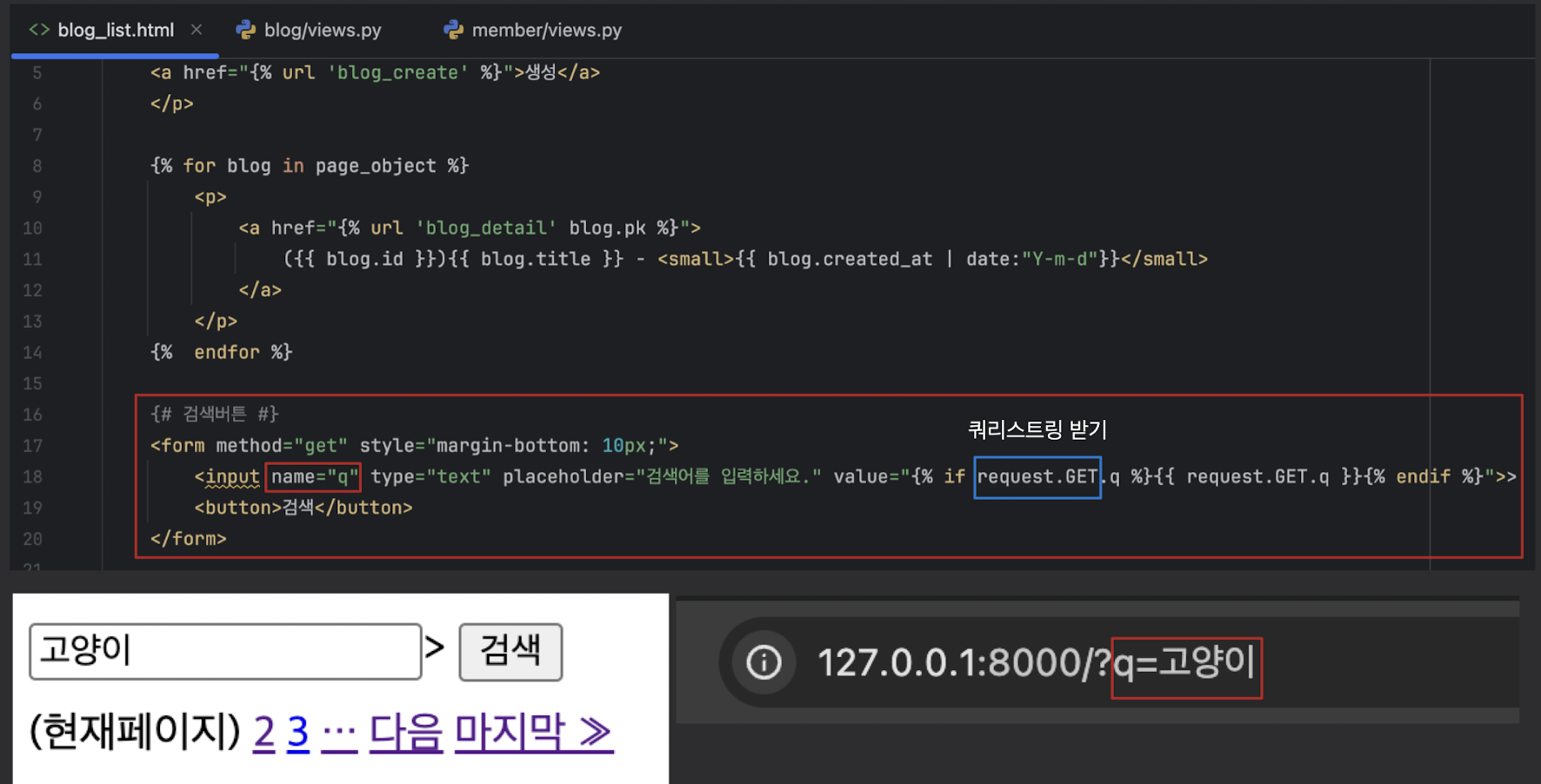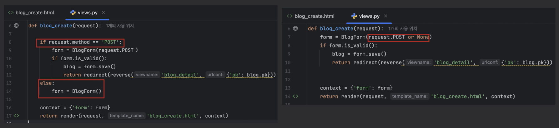 - GET 요청(페이지 처음 접속)은 request.POST가 없으므로 None이 들어가 빈 폼이 표시