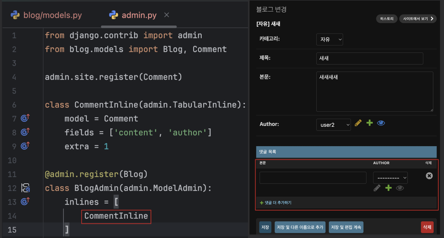 - 외래 키로 연결된 모델들을 한 줄씩 표 형태로 인라인(inline)으로 표시해주는 역할