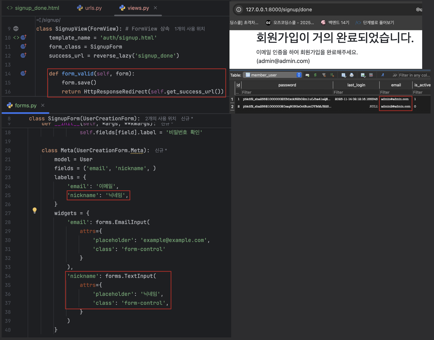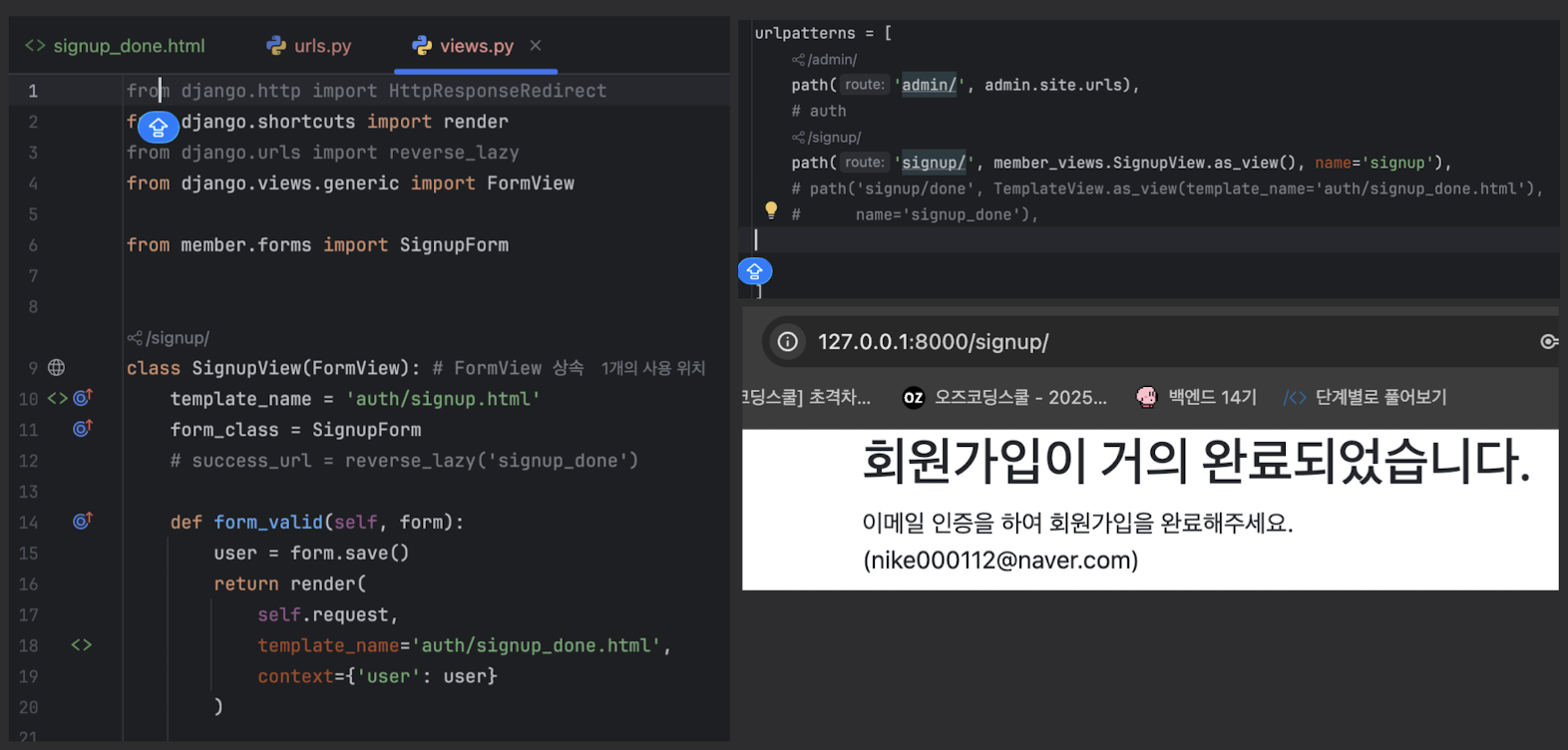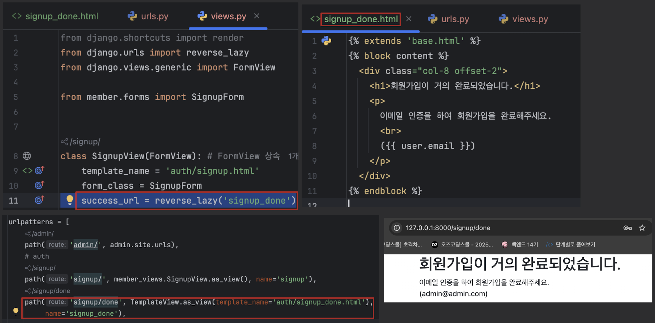 success_url = reverse_lazy('signup_done') 대신 form_valid에서 렌더링